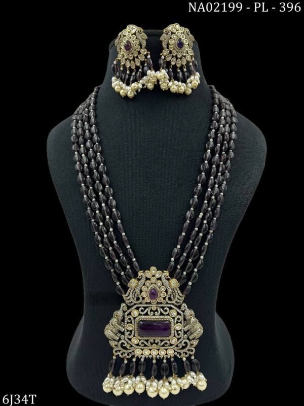 Embrace timeless elegance with this exquisite antique-inspired necklace set. Featuring five strands of deep purple beads and a stunning, oversized pendant adorned with intricate gold-tone detailing, this set exudes royal charm. The centerpiece is embellished with a large rectangular purple stone, surrounded by sparkling white and amethyst-toned stones. Dangling pearl and bead accents add a graceful touch. The matching earrings mirror the pendant’s grandeur, completing the luxurious look. Ideal for weddings, festive occasions, or cultural events, this set is a must-have for those who love statement jewelry with a traditional flair.