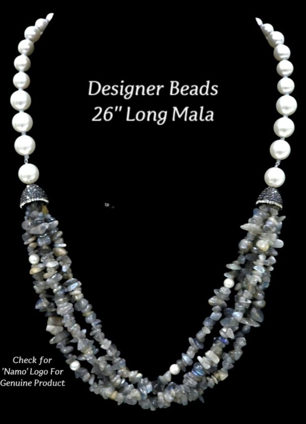 26″ long pearl and designer grey stone bead mala with a premium finish.
