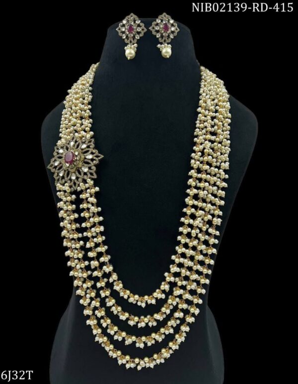 luxurious multi-layered pearl necklace set, crafted to perfection with rows of lustrous faux pearls. Featuring an intricate side brooch embellished with sparkling stones and a rich ruby centerpiece, this set exudes traditional charm and regal elegance. The coordinated earrings mirror the ornate design with ruby accents and dangling pearl drops, making it ideal for weddings, festive occasions, and grand celebrations. A perfect blend of heritage design and timeless beauty.