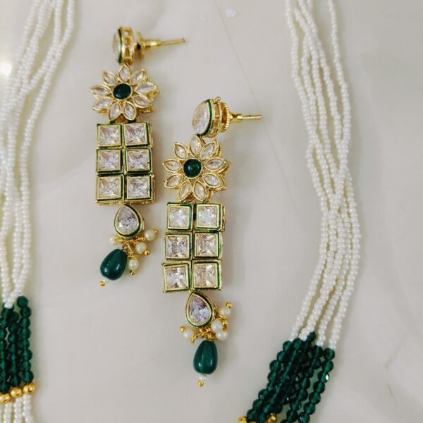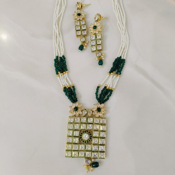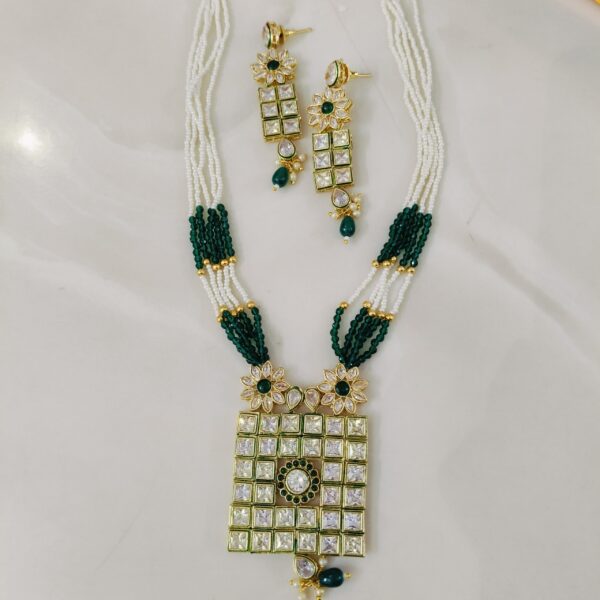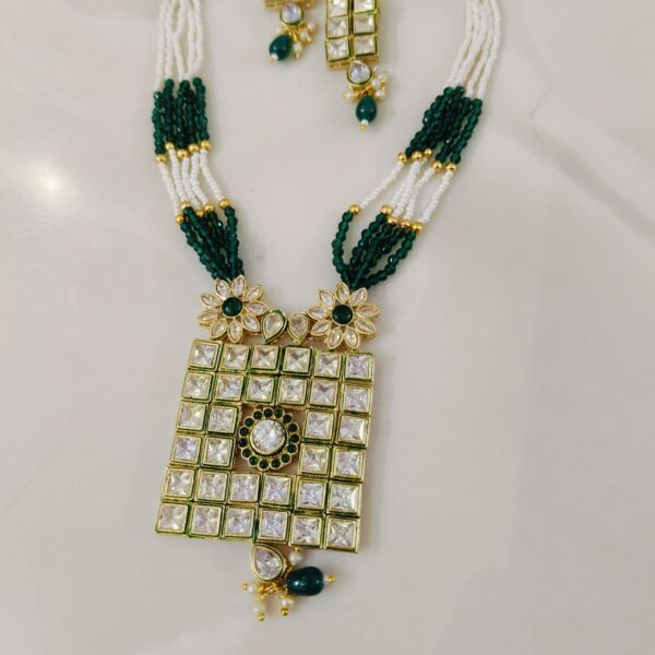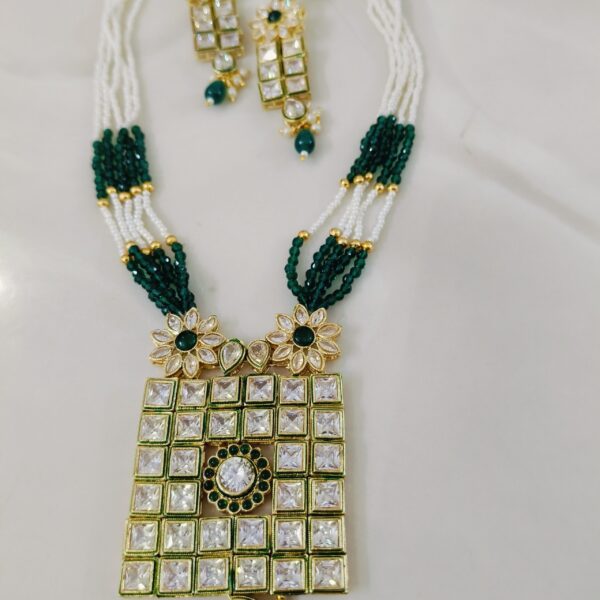 The necklace features a large, square-shaped pendant with intricate Kundan work, where polished gemstones (likely imitation or glass stones) are set in a gold-toned base. The pendant has a grid-like pattern with small, square-cut stones, framed by floral motifs. The necklace strand consists of multiple rows of white pearls alternated with sections of dark green beads, adding contrast and elegance to the piece. The green beads complement the green accents in the pendant and earrings.