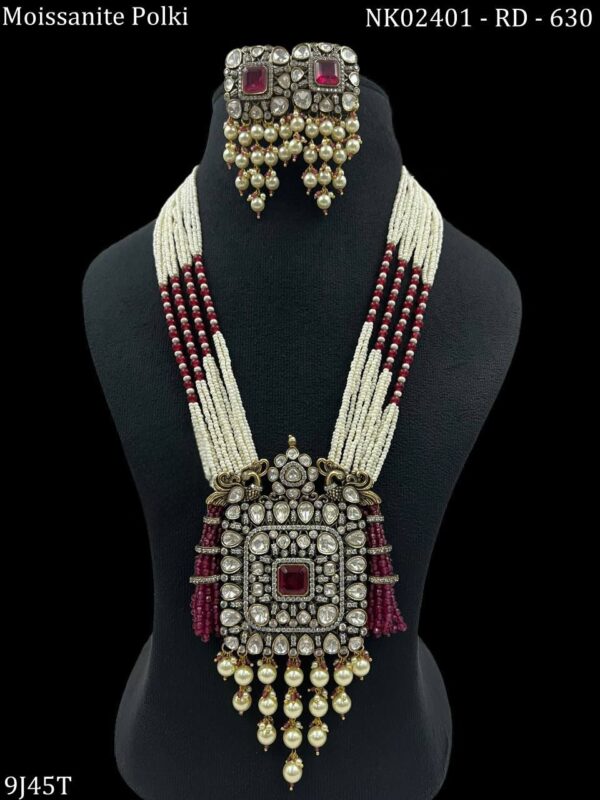 - Exquisite Moissanite Polki bridal necklace set with pearl and ruby beads, featuring a grand pendant and matching earrings. Perfect for weddings and special occasions.